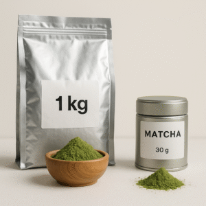 Bulk matcha refers to wholesale packaging formats such as 1 kg, 5 kg, 10 kg foil bags, or 25 kg drums, intended for cafés, factories, and distributors. Compared to small retail tins (30g / 50g), bulk matcha offers lower cost per kilogram and is easier for B2B buyers to manage.