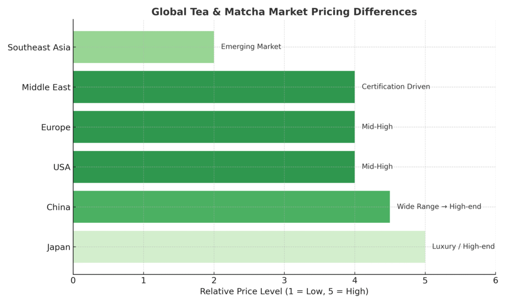 - Japanese matcha (Uji, Shizuoka, Nishio) is positioned at the premium end.