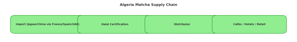 Algeria’s large consumer base and strong tea culture provide a promising opportunity for matcha suppliers. Halal certification and regional logistics hubs (France, Spain, UAE) are key to entering the market efficiently.